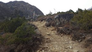 Gelukkig was Bakhta, één van de porters, altijd kort bij hem in de buurt. Daarnaast presenteerde Chhitup ons al lopend heel wat interessante informatie over het gebied, de mensen, het leven in de dorpen en liet hij regelmatig Nepalese liedjes welluidend tussen de bergen galmen.