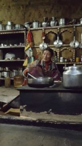 Het waren homestays in de totale betekenis van het woord. Alles moest nog geregeld worden op het moment zelf. Hun leventje liep gewoon door en wij mochten er even deel van uitmaken. Toekijken hoe Tibetaanse boterthee gemaakt werd (maar niet door ons gedronken), hoe de aardappelen tot een pikant prutje werden geroerd en verrassend goed smaakten, maar ook moeten vaststellen dat het toilet tegelijkertijd als afwasplaats dienst deed… Afwassen gebeurde met koud water, met een vuil smoezelig doekje waarna het vettige afwaswater dienst deed om het toilet door te spoelen.